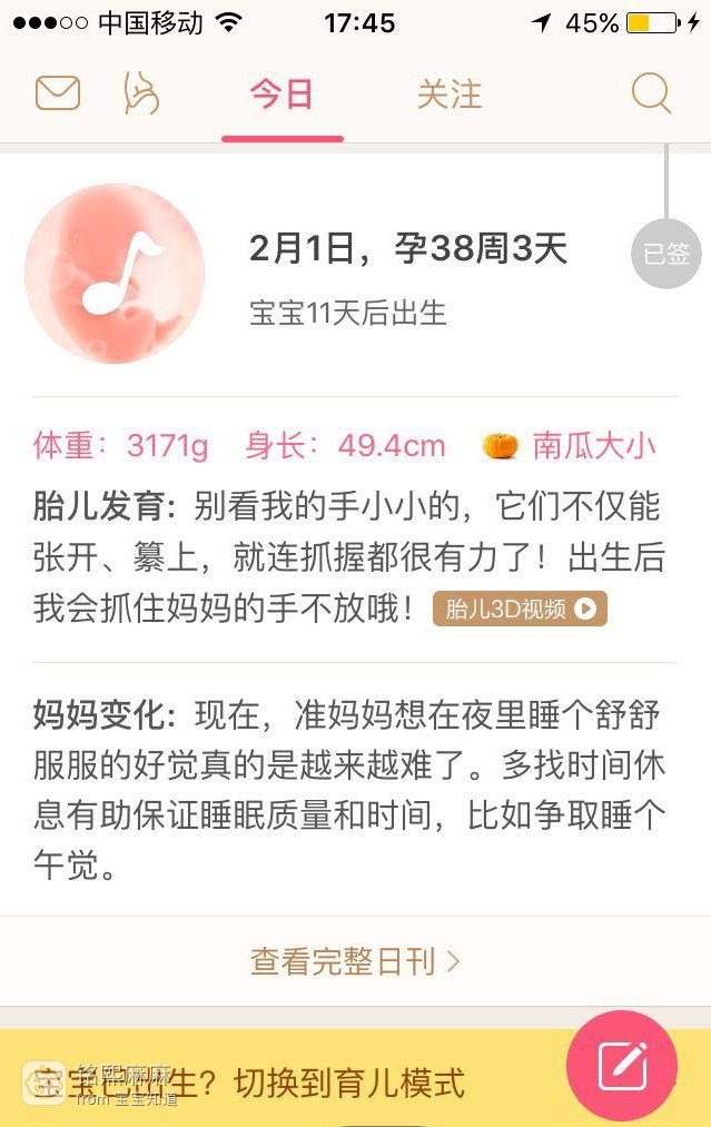 这周是我孕期的第38周,不知不觉离预产期还有10天,马上进入个位数倒计时,内心是无比的幸福与激动。看着图上显示宝宝随时都可能出生,作为一个新手妈妈又有一点担心,怕自己做不好一位合格妈妈。