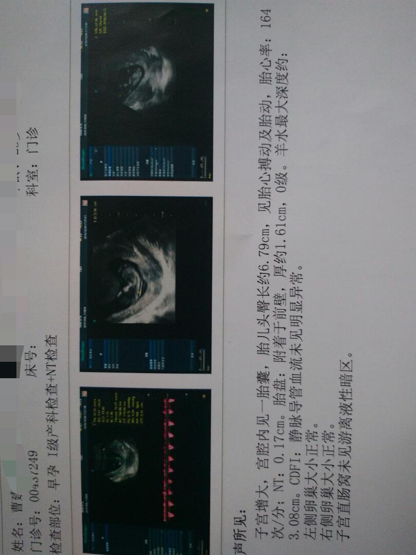 第一次去医院检查确认怀孕,马上换药了(对宝宝没有影响的药),中间各种担心我的宝宝,第二次去医院检查宝宝胎心胎芽,宝宝发育的很好哦(还是在吃药),第三次也就是昨天(9号),检查NT还有甲亢,到今天才去拿的报栋菠告单,各种开心,一切都正常,宝宝长的很好,甲亢也好啦!谢谢我的宝宝。