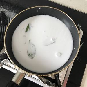 4.调椰浆。在椰浆里加入细砂糖、盐、玉米淀粉,搅拌均匀。倒入锅内,加入薄荷叶。烧至初沸起泡。这样做出来的椰浆里会有薄荷的香气,我是超级爱薄荷,所以才加了薄荷,不喜欢的也可以不加!(最初开始做的时候,我没有加玉米淀粉,椰浆会相对稀一些,后来参考了美女厨友:Moli-茉莉 的泰式芒果糯米饭做法,加入加玉米淀粉调椰浆,果然椰浆变得稠一些👍)
