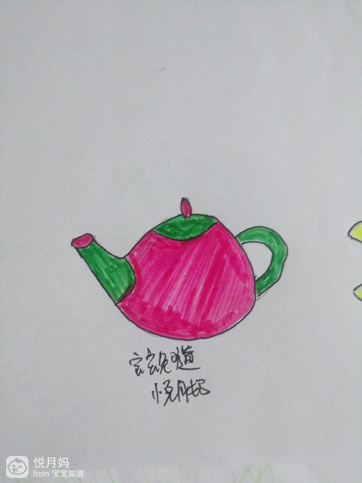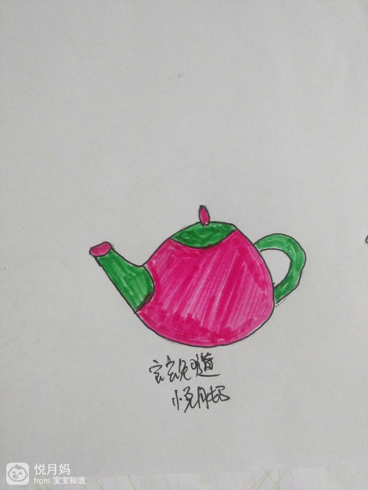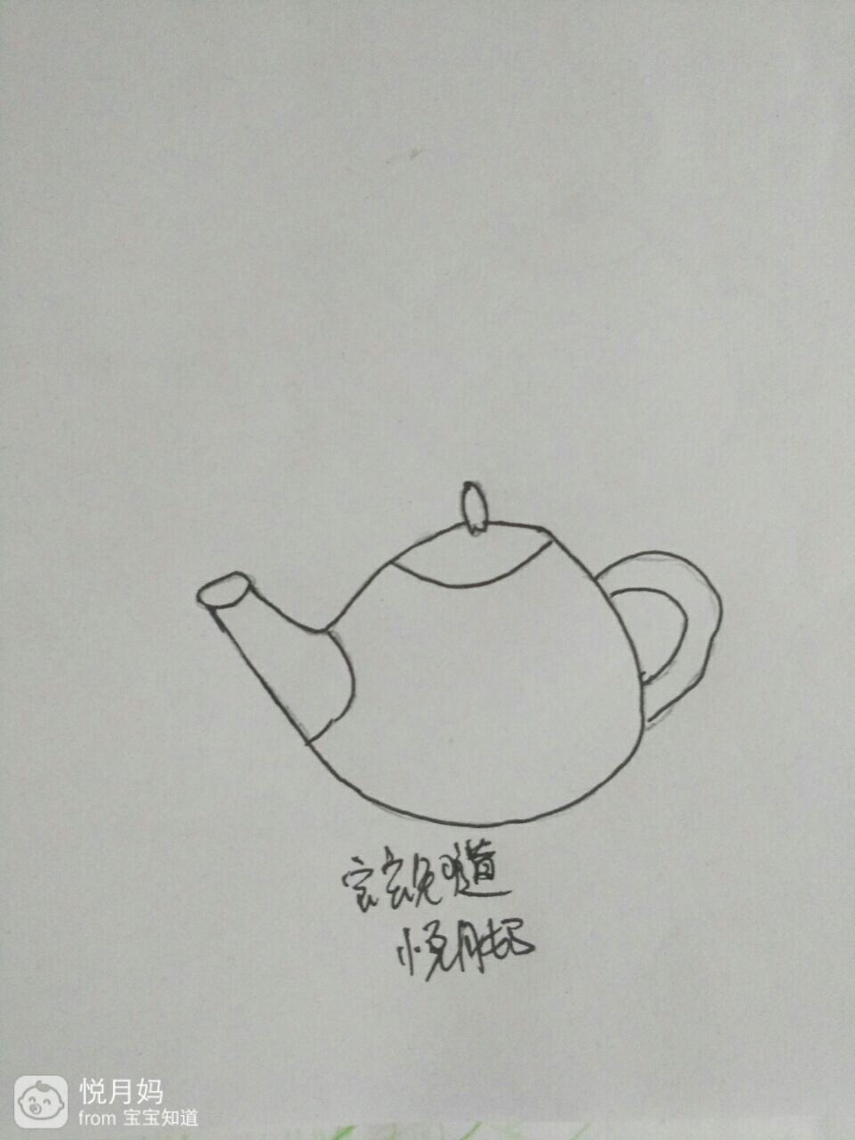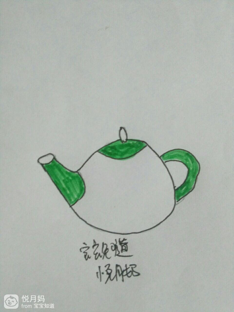用青色的水笔把茶壶嘴,茶壶盖儿和我们握茶壶的地方,用彩笔涂上绿色青色。