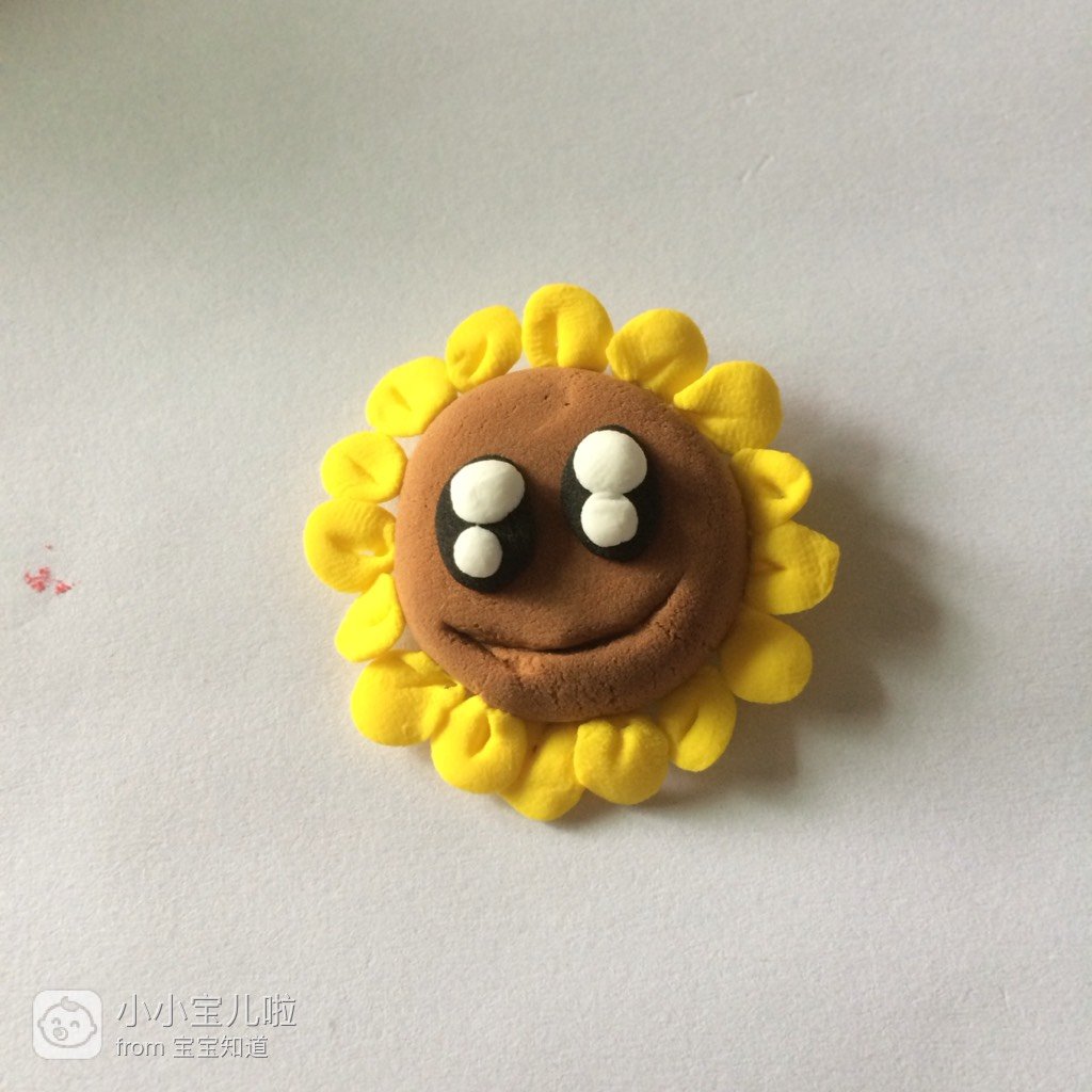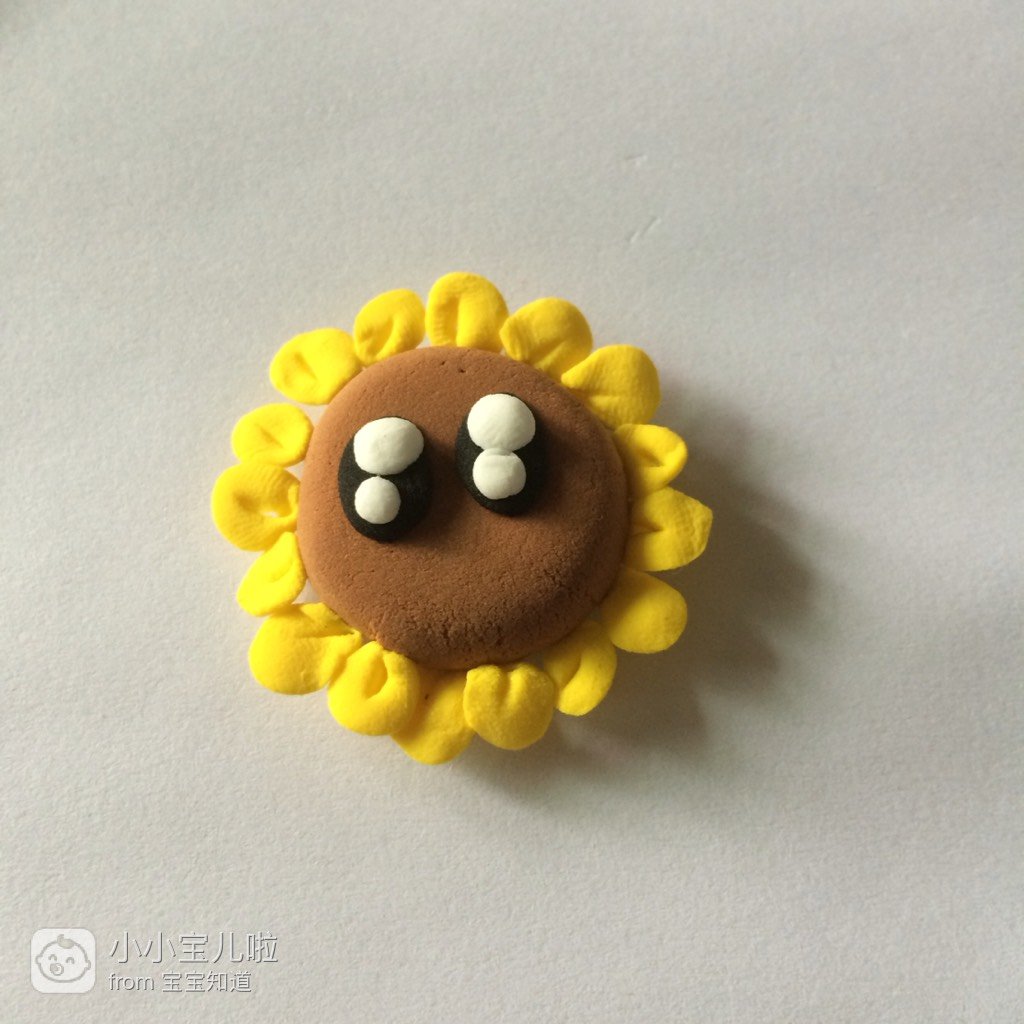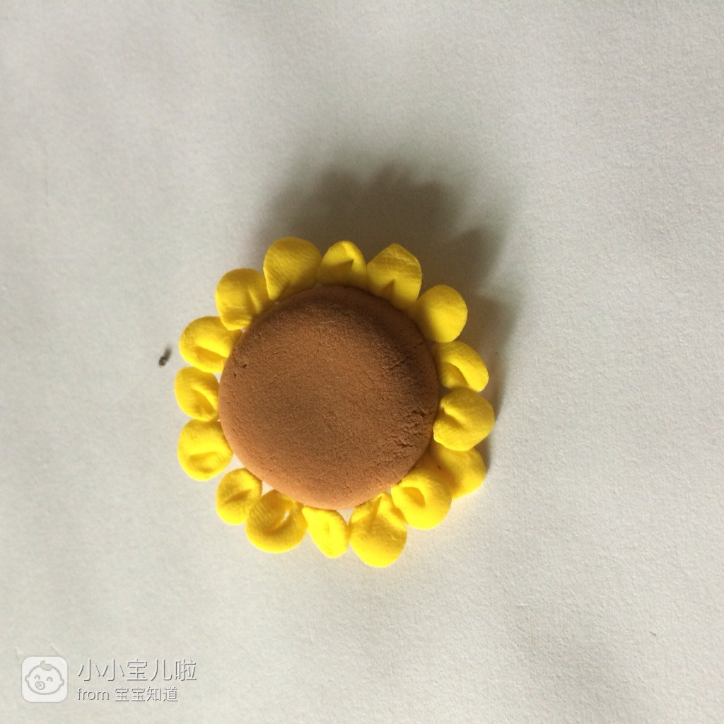 取灰色的粘土搓成圆柱形,作为花盆,把向日葵插上,这样一盆裁孟向日葵小盆景就完成了。
