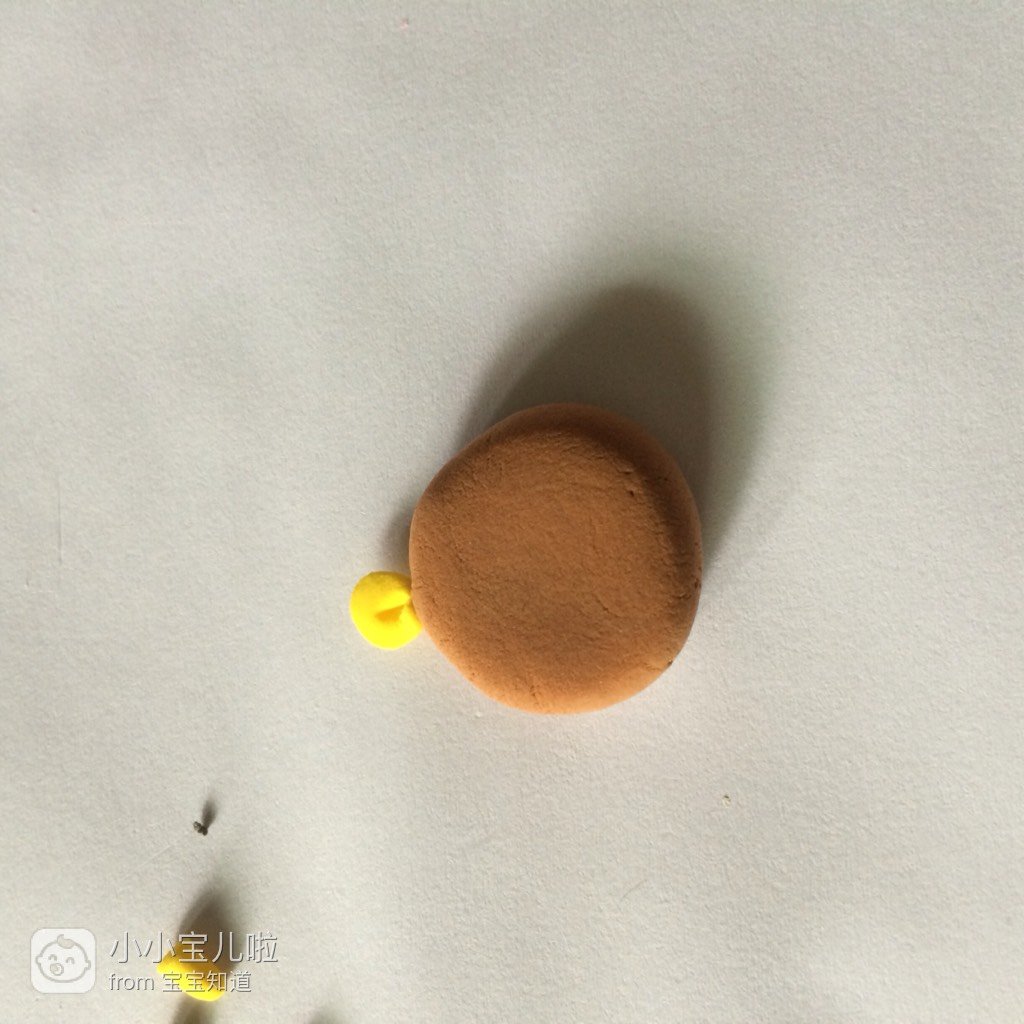 然后把小粒弄成圆,压平一下,用工具刀在中间的位置划出一横,粘在棕色的圆上,如图