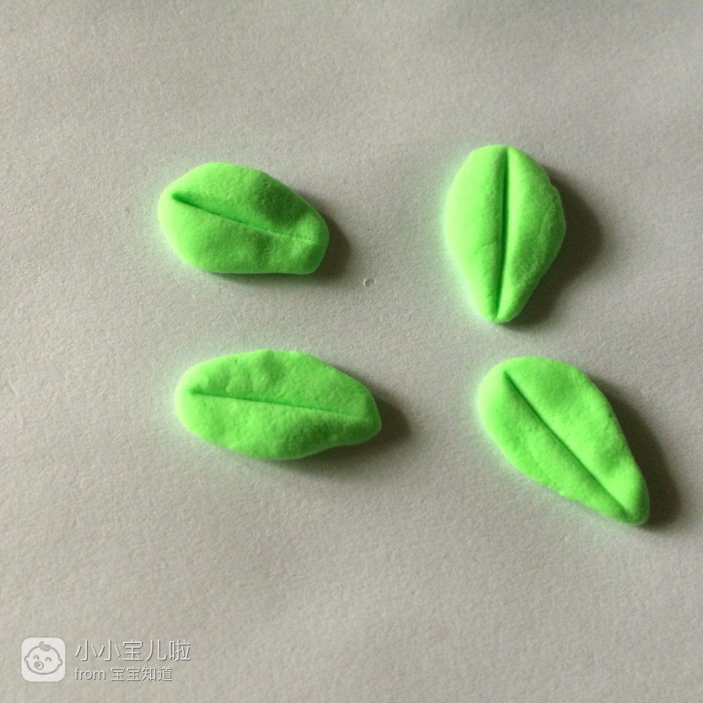 取绿色的粘土搓成长条后,分成四小粒,然后搓成水滴的形状,用工具刀在水滴上划一下,这样叶子就弄好了