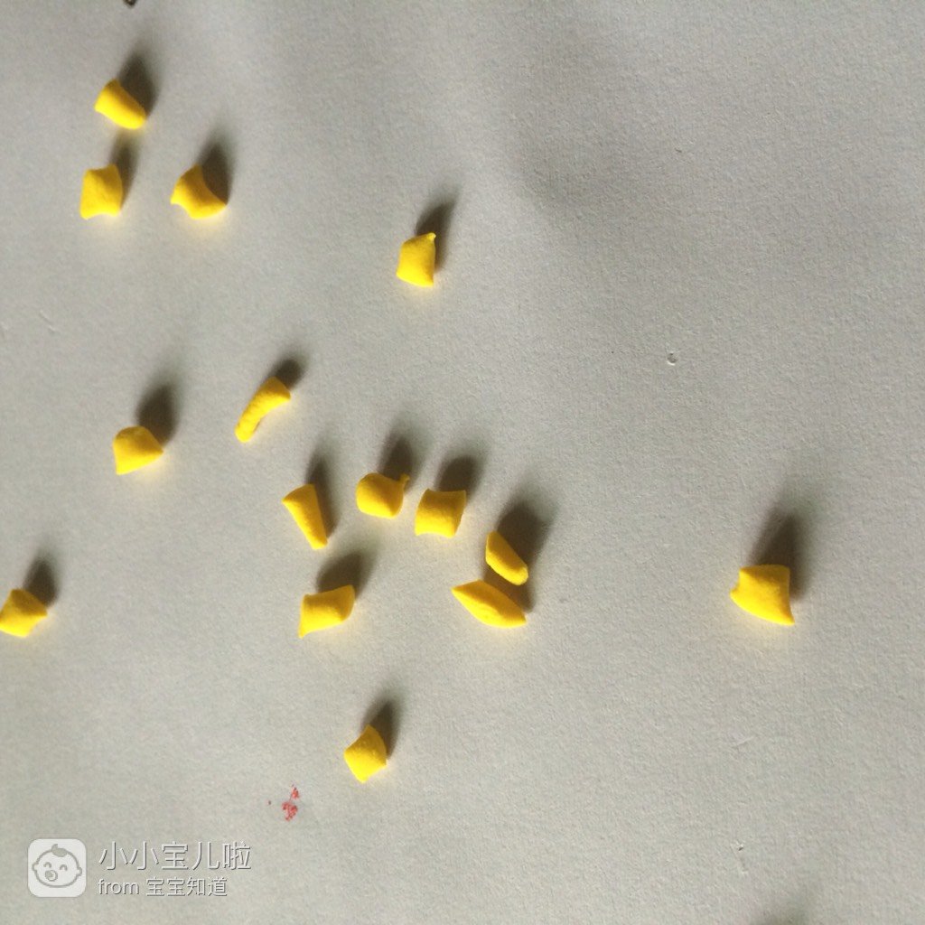 取黄色的粘土搓成长条,然后把长条平均的分成若干份,如图