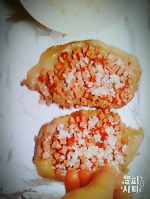 把火腿切碎,奶酪放在餐具里。把白沙拉酱涂在肉片上,再把火梅它腿、奶酪、水芹菜撒在上面,然后放进烤炉里烤