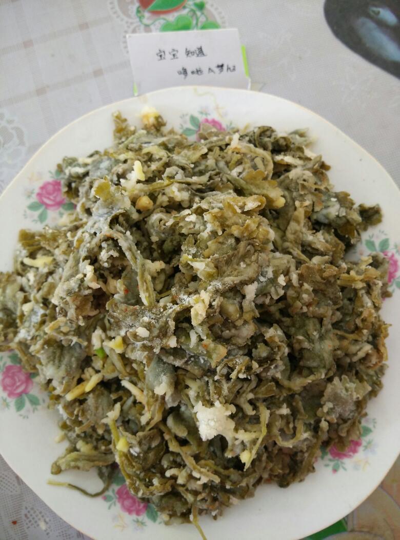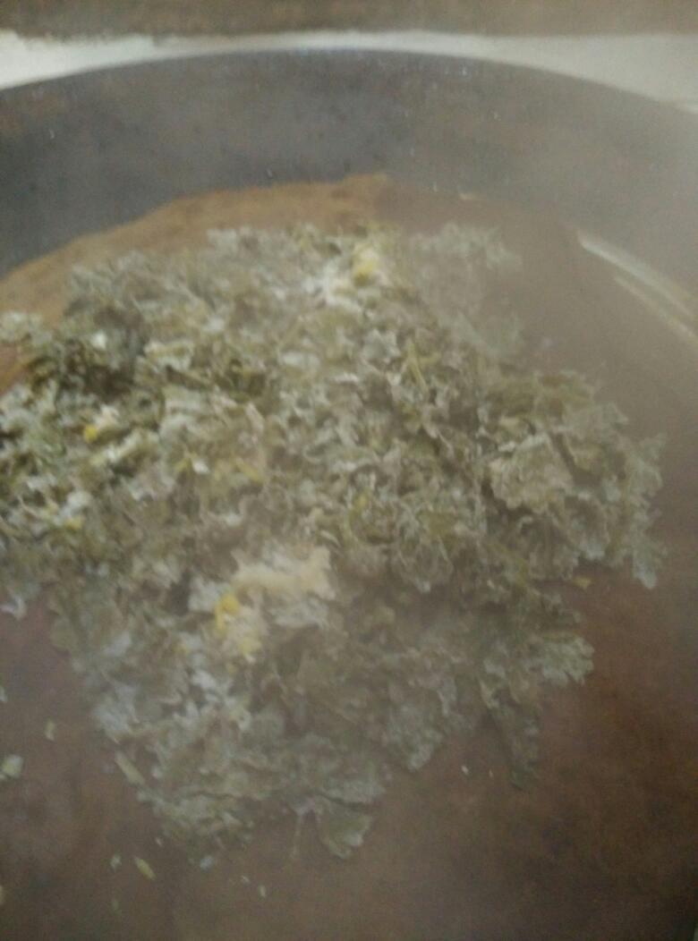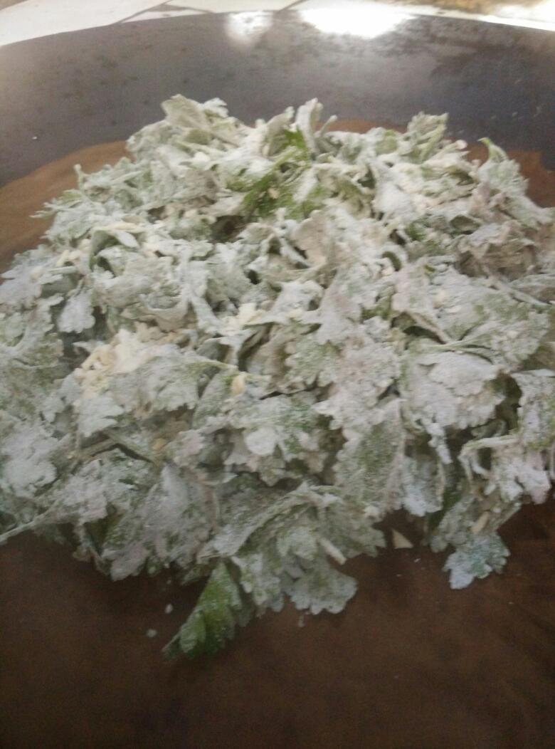 看看用面粉拌好的芹菜叶,一定要拌散开来,要不蒸熟就会一坨坨的。