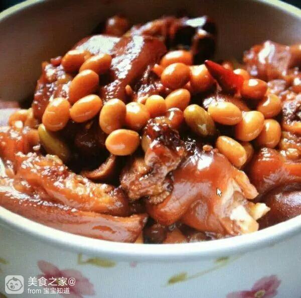 用料: 猪蹄、黄豆、葱、姜、八角、桂皮、干红辣椒、香叶、料酒、生抽、老抽、冰糖;