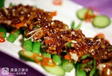 6. 长盘摆放焯熟的芥兰段,将牛肉卷码放在上面掏兔,黄瓜片,红辣椒丝装饰,即可。
