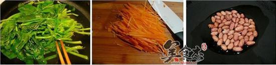清炒花生仁仁的做法 1. 菠菜洗净,用加了盐和油的开水飞过,用凉水过清,控水后切段