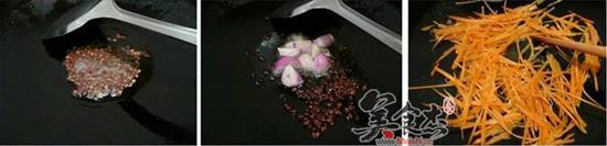 6. 将胡萝卜丝下入葱椒油中煸软