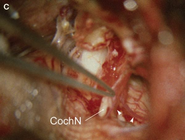 A. 右侧听神经瘤,大小1.5cm。不能分辨耳蜗神经。肿瘤内减压有利于分辨耳蜗神经。面神经未见。术前检查显示言语识别分值为92%。B和C. 肿瘤切除后,可见覆盖有蛛网膜的耳蜗神经和面神经。注意:耳蜗神经供血动脉位于其腹侧面(C. 箭头处)。术后电测听提示语音识别明显改善,语言识别分值为96%。