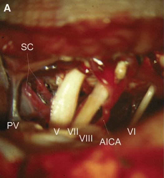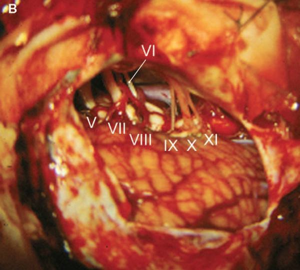 图1:枕下乙状窦后入路从术者视角展示的右侧CPA的解剖结构。患者仰卧位,头向对侧偏转。