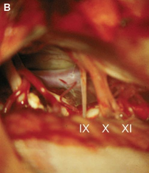 首先在颅底切开硬膜,轻轻抬起小脑组织,显露小脑延髓池,释放脑脊液。这个操作非常重要,可使小脑组织松弛、退缩远离岩骨背侧面。随着小脑松弛,再进一步切开硬膜,向乙状窦方向翻开硬膜瓣,丝线牵拉固定。