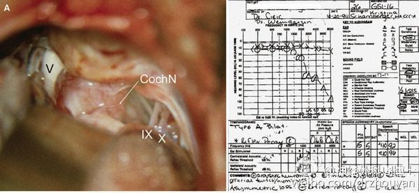 A. 右侧听神经瘤,大小1.25cm。面神经位于肿瘤后方。术前双耳言语识别分值为96%。B. 肿瘤切除后术中图片。注意看内听道后壁被磨除。耳蜗神经和面神经表面覆盖有白花花有光泽的蛛网膜。术后电测听显示双耳听力与术前无变化。