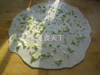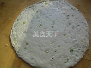 4 然后撒上刚刚准备好的葱花和咸鲜油。擦匀即可。再从上往下卷,卷的越细崭小越好。卷好后对折如下图、
