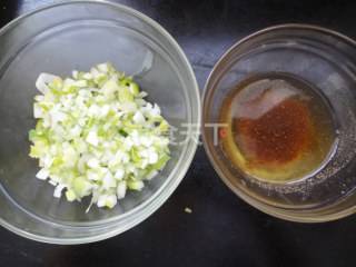 1 葱切碎装碗备用,另一个碗里放入菜籽油、一勺盐、一小勺十三香、小半勺味精备用。