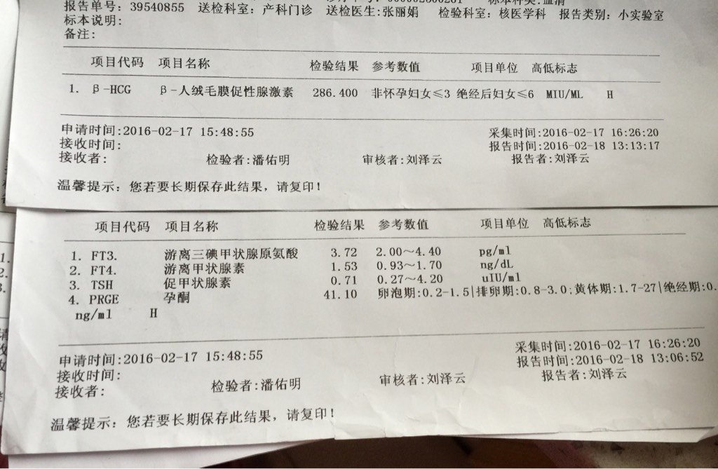 末次1月21号,2月18号hcg286孕酮41(大单位),由于去年胎停过,后来查处抗心磷脂阳性吃了三个月要转阴,这次很小心,测出怀孕就在家休息卧床,可是21号晚上出血了,鲜红的但量不多,吓得我一晚失眠,第二天去医院检查,因为还只有33天B超也看不出,就再复查了一个血值,2月22号hcg2083孕酮50,24号hcg3838孕酮59,剩殖医生开了一个星期的黄体酮针和绒促,医生说血值正常,但是今糟评天又出了一点鲜红的血,好担心不知道什么原因!保佑我的宝宝健健康洞坊豆康!