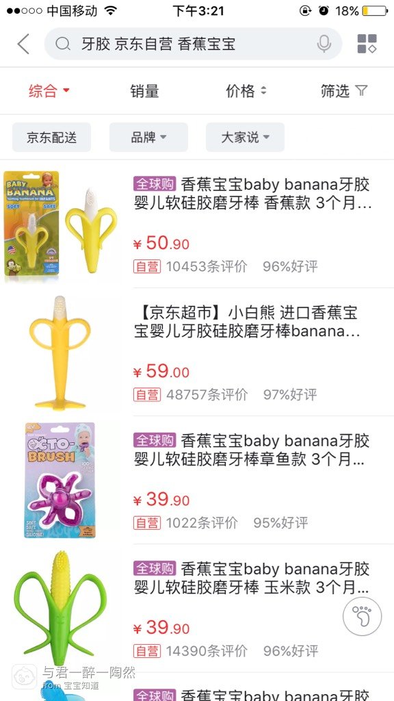 我网购比较相信某东自营的,在网上查啊查,发现了各种这样的咬胶,其中香蕉形状的特别多,我就定了,买香蕉的缘朗苦吧。那几天二妹的纸尿裤恰巧囤的够贵挡多,没必要在网上买,看看咬胶什么价格都有还得付运费,不能和纸尿裤一起买来,我想就算了吧,去了否舞我们这一个比较大的孕婴店买,价格是50元。