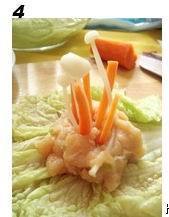 4. 取一片菜叶,把肉馅放在中间,然后把胡萝卜丝和怪凡蔑金针菇插在肉馅上。