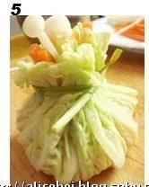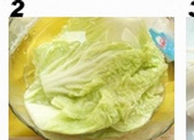 2. 先将白菜叶洗净,留叶子部分;烧开水后关火,将白菜叶放入焖五分钟,然后它缠捞出放在凉水里备用;