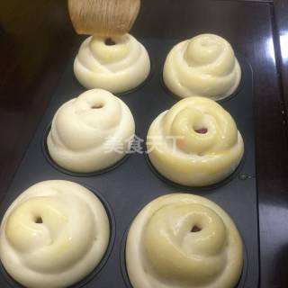 15 发酵至两倍大后拿出,停留2分钟左右后扫上全蛋液。此时可以同时预热烤箱,把温度调到180度,上下火。