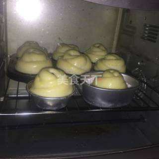 14 全部做好后把面团摆放在烤盘里,并放入烤箱进行最后的发酵,发酵时可以拿一杯热水进烤箱帮助面团发酵。