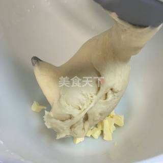 4 当面团搅拌至可以拉筋时就放入软化后的黄油一起搅拌。