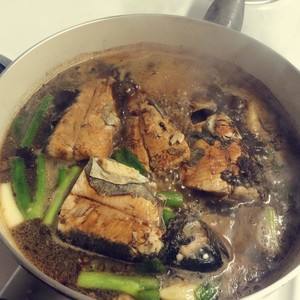 调大火。加入狗堡葱段,大蒜。白糖。大料一颗。五香粉少许。花椒,辣椒面少许。生抽。加热水,末过鱼身一半。加入啤酒和红剑吉酒。加老抽。然后转小火。炖20至30分钟。然后反面再炖20至30分钟。