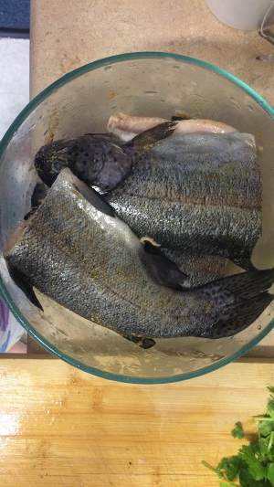 鱼从中间断开。加了一些料酒和姜末腌制一会。