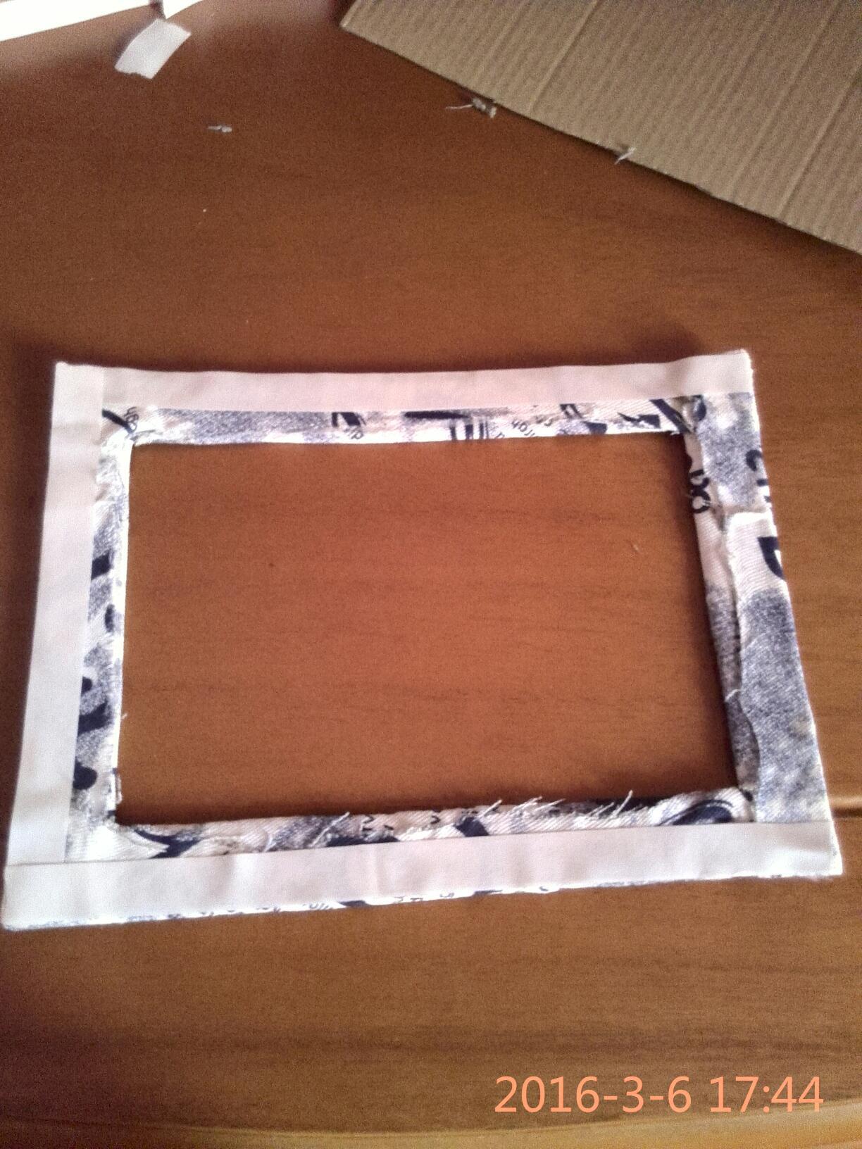 7.把剪开的布折过来,用双面胶把布贴在纸板上,然后把多余的布剪掉