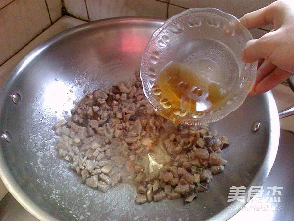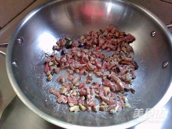 5. 炒锅热油,放入香菇、牛肉丁翻炒均匀