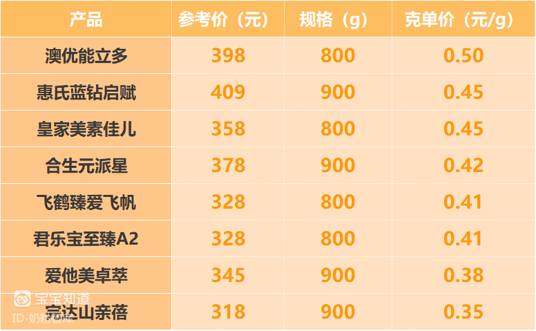 小结:从上述8款奶粉的克单价来看,所有奶粉的克单价都在0.3元/g以上。其中,澳优能立多的价格相对偏高,克单价约为0.50元/g。