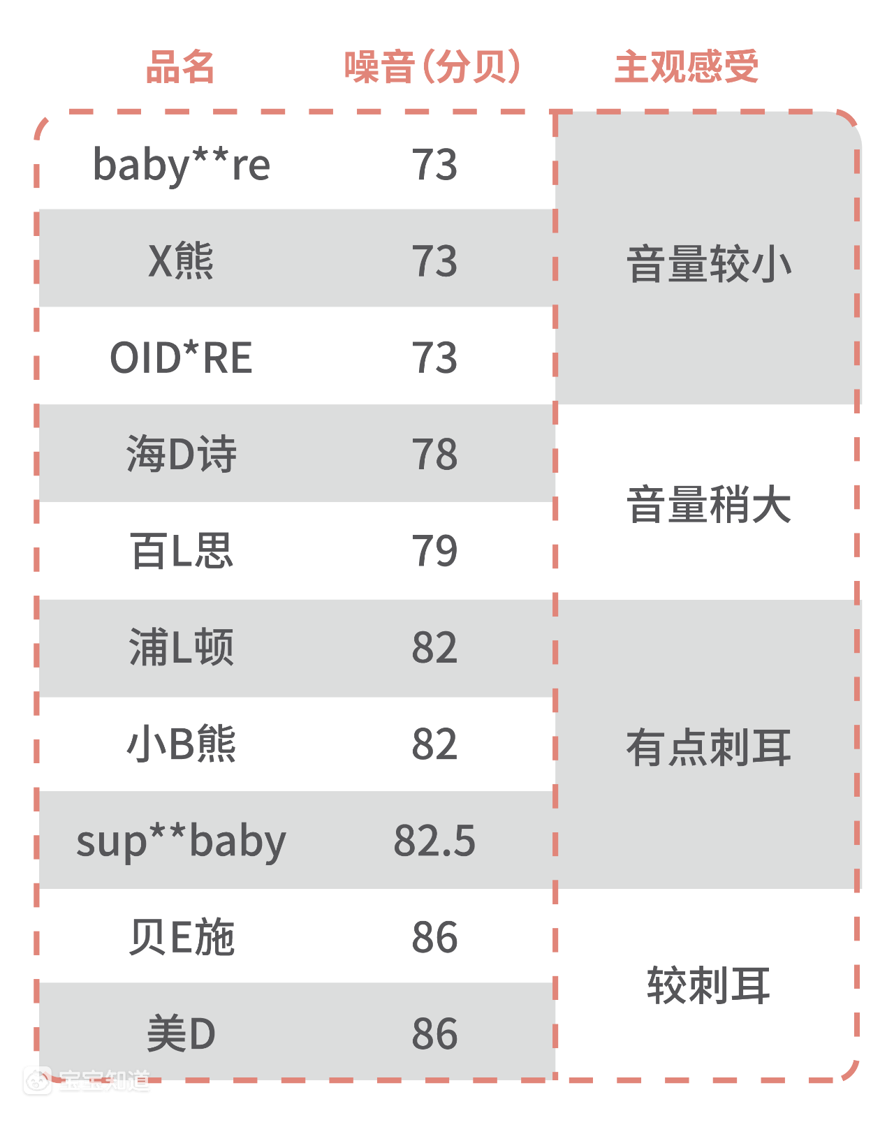 以人耳的感受为准,噪音低于80分贝的baby**re、X熊、OID*RE、海D诗、百L思,在接受范围内,其他款的噪音则比较刺耳。