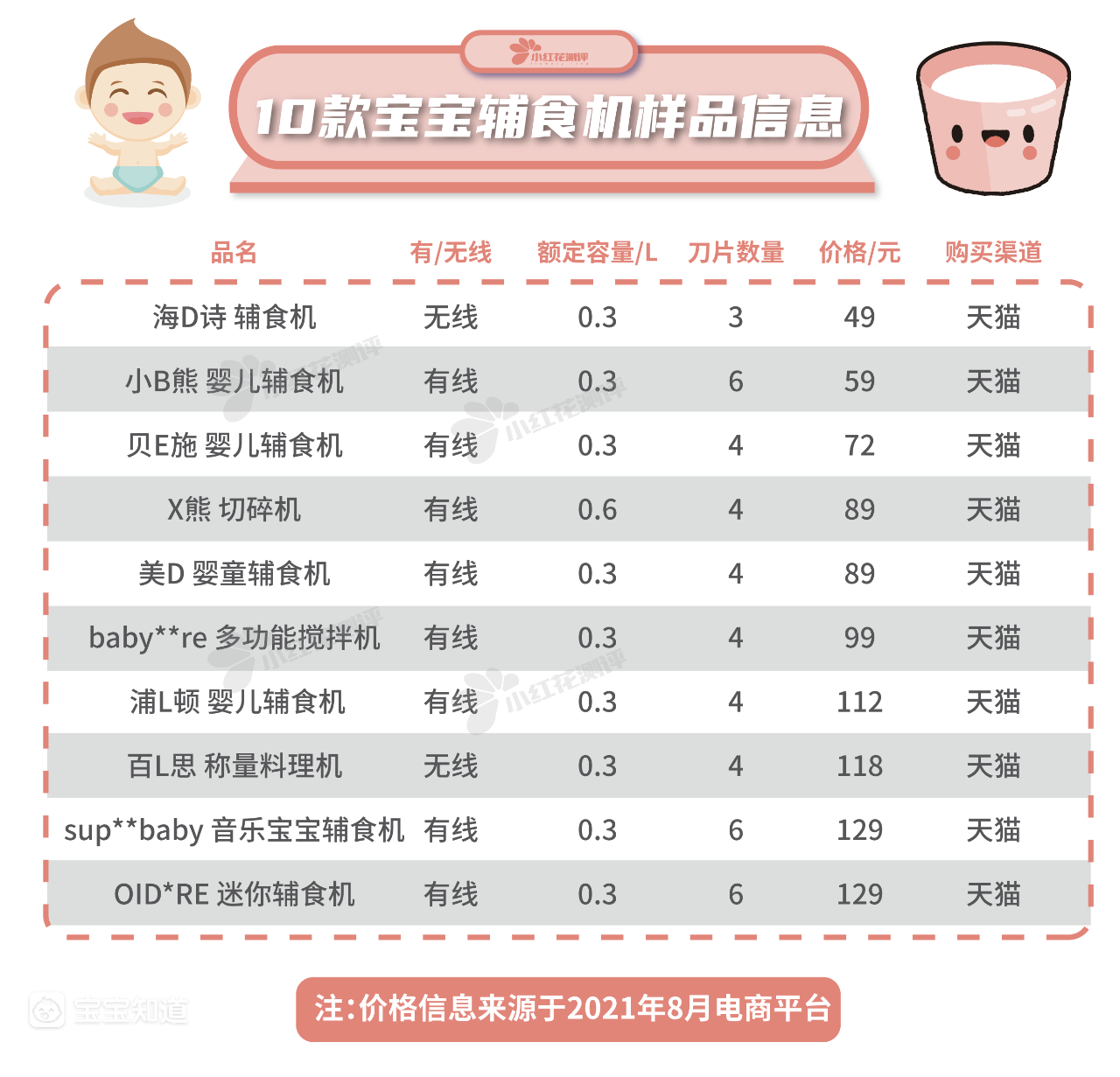 根据品牌知名度和销量,选购了10款150元以下的宝宝辅食机进行测评。