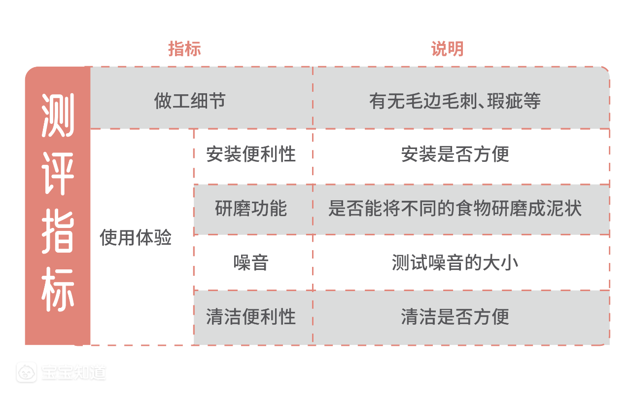 主要考察辅食机在安装便利性、噪音、研磨功能和清洁便利性,这4个方面是否能满足家长的使用习惯。