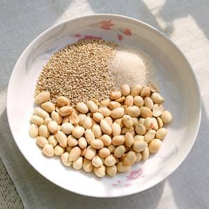 花生和白芝麻炒熟,剥去花生皮。
