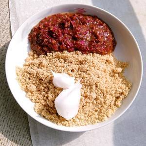 花生,白芝麻和白糖放入料理机打概瓦用碎,玫瑰蜜饯用刀剁碎,加入猪油和匀。
