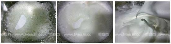 5. 蛋白分三次加入剩余的白糖,打发至湿性发泡