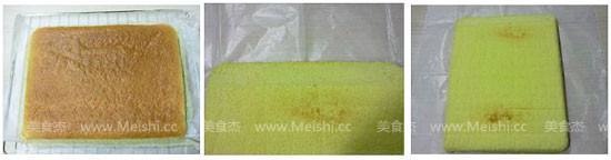 从朋友家回来后,继续试验院栋,再次减量;在打发蛋白的时候严格控制在湿性发泡的状态;同时缩短烘烤的时间,从原方子的15分钟缩短为12分钟。烤出来的蛋糕片柔软、湿润,有弹性,上色均匀,光泽度很好。终于做出了完美的小山蛋糕卷。