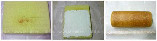这个蛋糕卷我连续做了三个,因为我的烤盘跟原方子的烤盘大小不同,第一次试验虽然减了量,烤出来的蛋糕片依然偏厚,一卷就断裂了,而且家用小烤箱的上色容易不均匀。