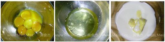 1. 蛋黄、蛋白分别称重,牛奶和黄油放入同一个碗中。(减量后的蛋是4个)