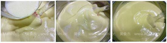 4、牛奶和黄油的混合液最好顺着橡皮刮刀慢慢洒在蛋糕糊表面。