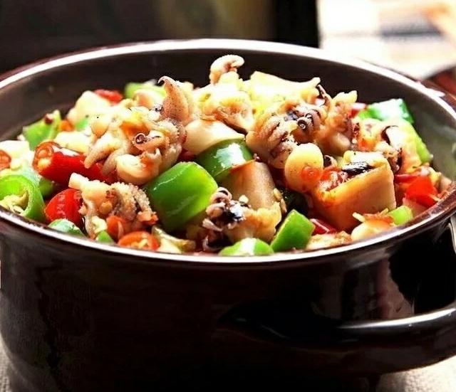 1.把小墨鱼头投入沸水锅快速汆一水,再入热油锅里滑油待用。青笋和藕切成丁,也入沸水锅汆一水待用。