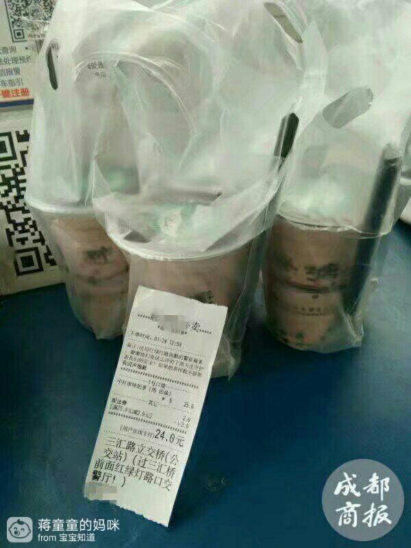 24日下午,当在寒风中执梨勒吊勤的交警蜀黍回到岗亭时(绵阳市交警直属一大队御营大桥岗亭),碰见外卖送来5杯热气腾腾的奶茶。