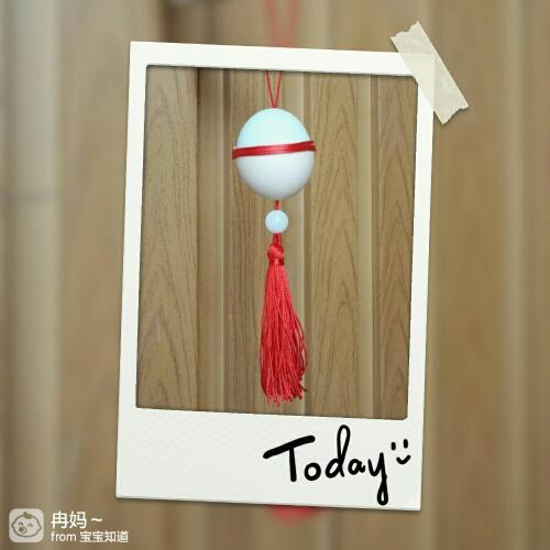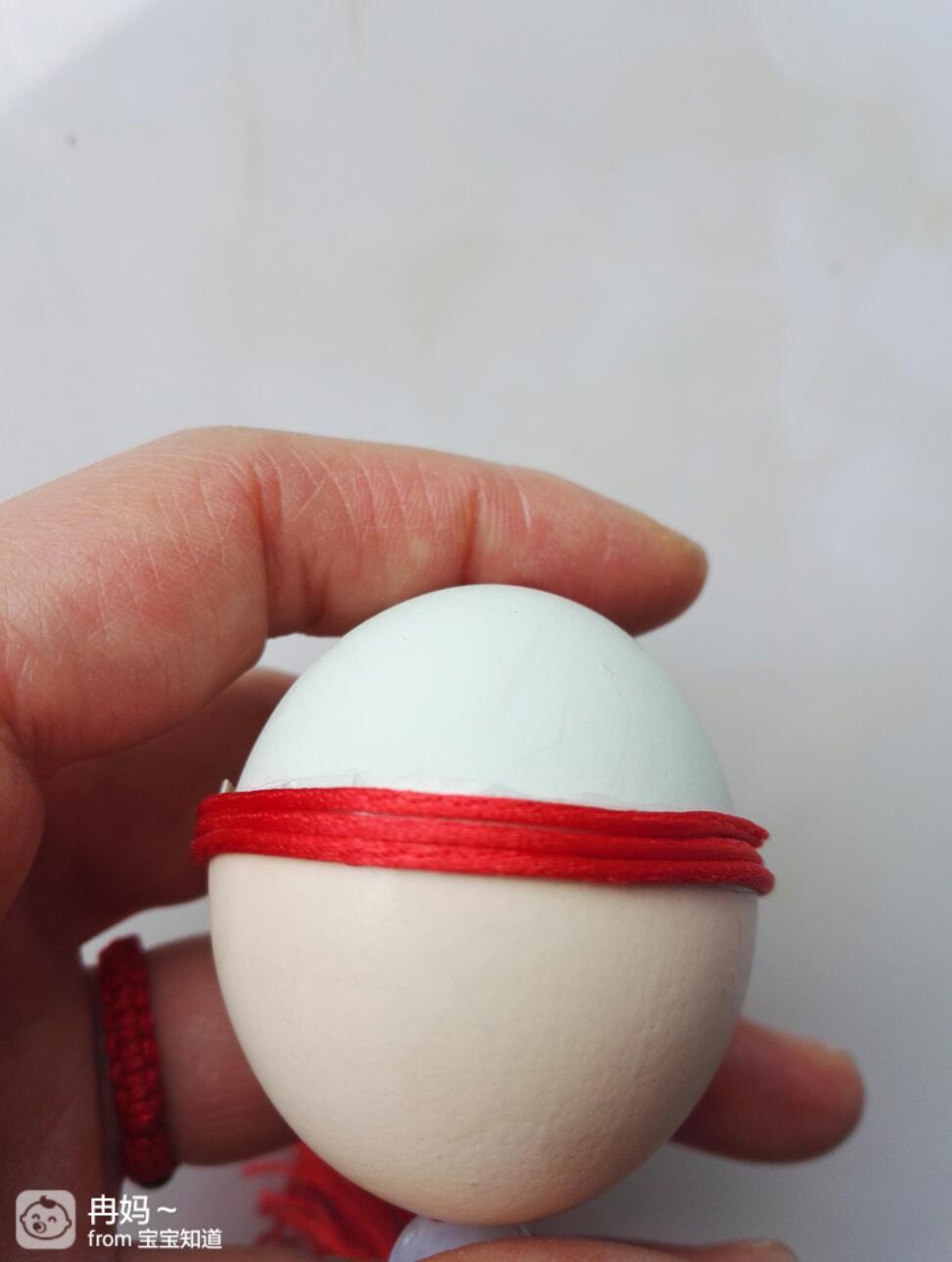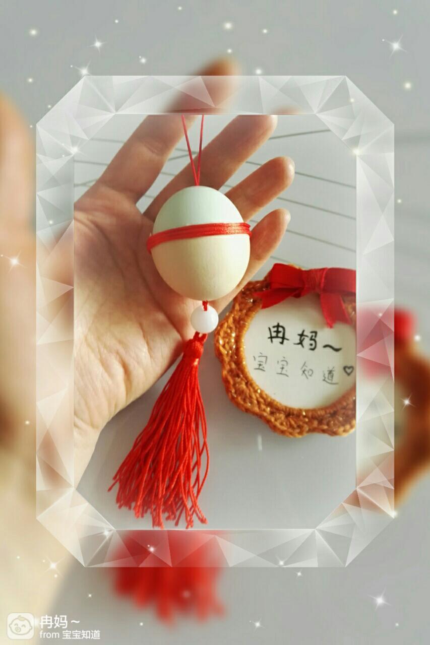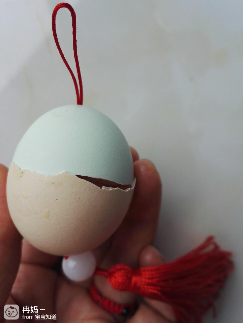 外面看是这样的。红绳成了吊绳。拉起吊绳,里面的珠子就固定住蛋壳了。