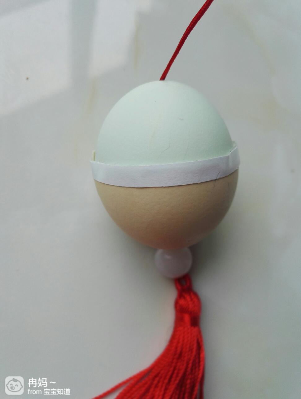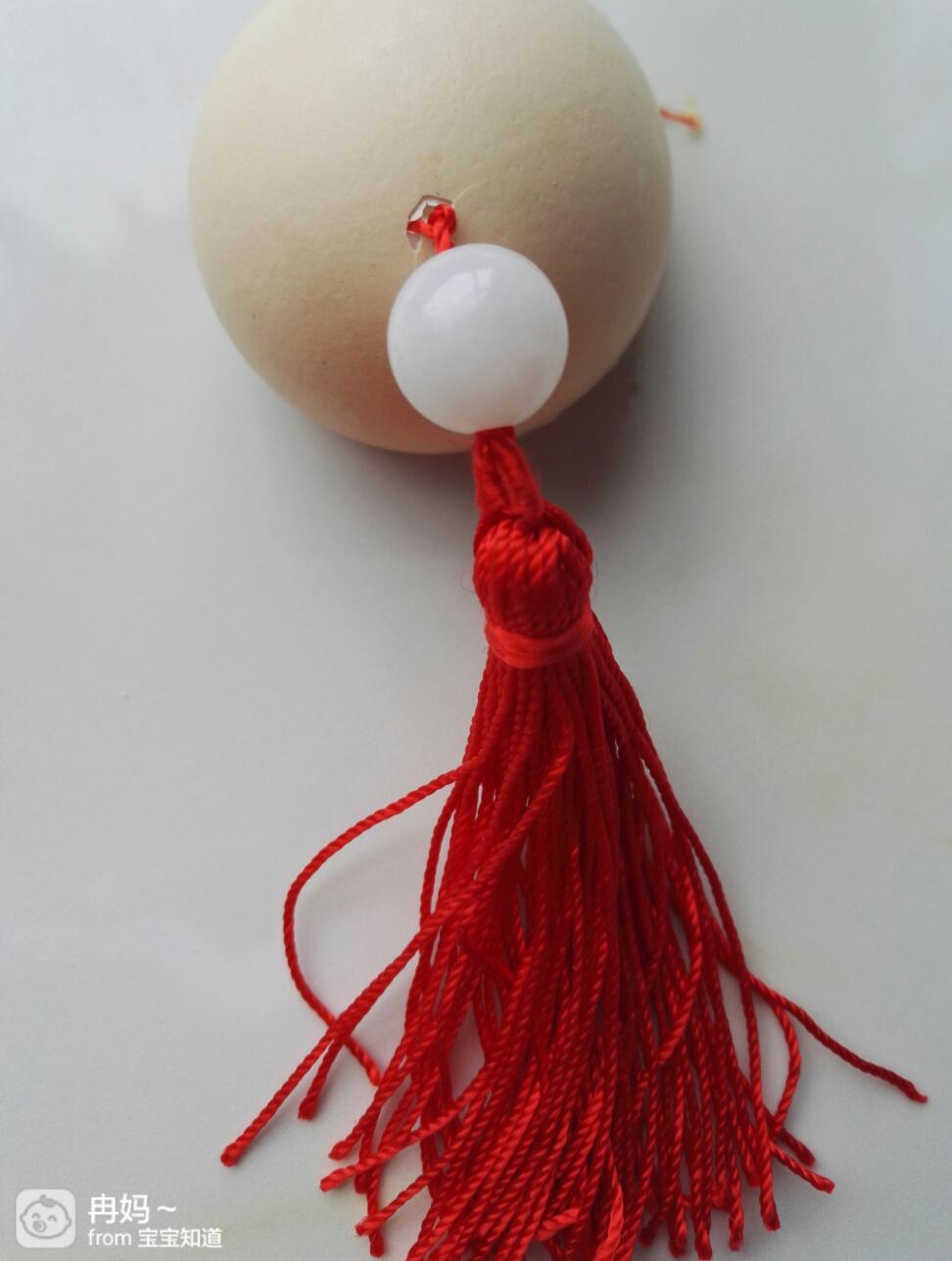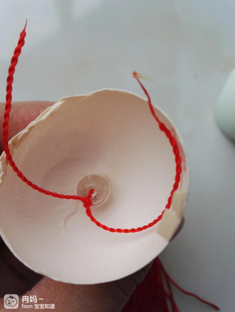 把流苏上面的绳子从外到内穿进另外一个鸡蛋壳的小洞内。
