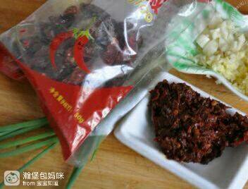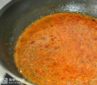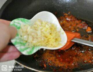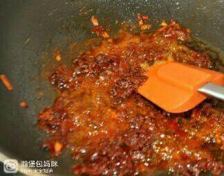 锅子烧热,倒油,放入剁碎的豆瓣酱,煸炒出红油。挡寸