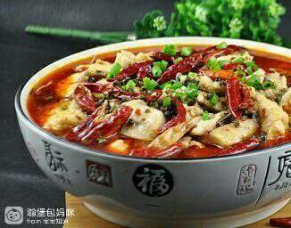 “水煮鱼(fish filets in hot chili oil)”,又称“江水煮江鱼”,系重庆渝北风味。看似原始的做坐室婚法,实际做工考究--选新鲜生猛活鱼,又充分发挥辣椒御寒、益气养血功效,烹调出来的肉质一点也不会变韧,口感滑嫩,油而不腻。既去除了鱼的腥味,又保持了鱼的鲜嫩。满目的辣椒红亮养眼,辣而不燥,麻而不苦。“麻上头,辣过瘾”,让水煮鱼在全国流行得一塌糊涂。