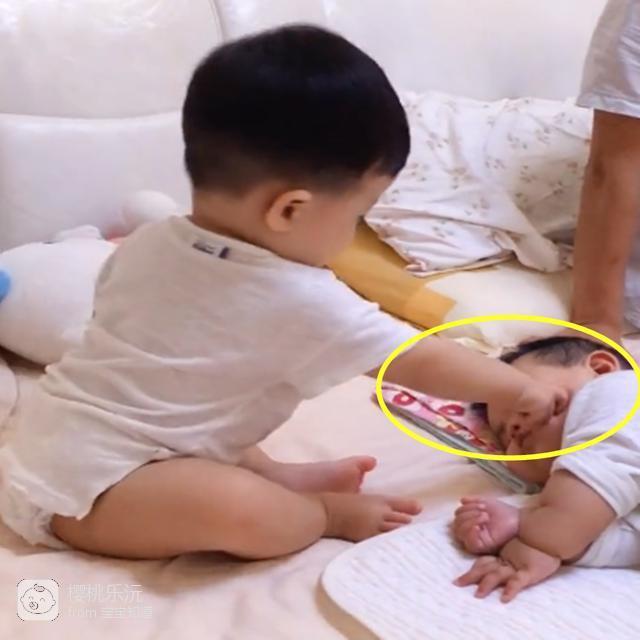 在看了一会后,又用自己的小手指去戳弟弟的小脸蛋,像画圈一样,来回划拉。旁边的一个大人阻挡后,小哥哥还拿着手指隔空在戳弟弟的小脸蛋,之后实在不好去戳,就去戳床上一下。