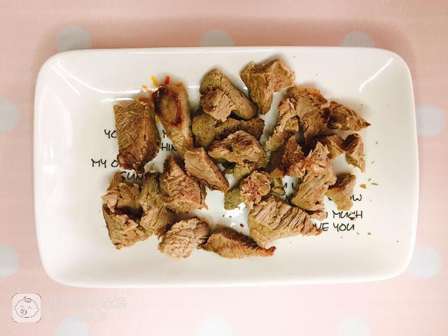 3.煮熟以后的牛肉捞出来控水,控好水的牛肉块,放到辅食机中搅打成细小的肉粒。如果小一点的宝宝,可以将肉再打的细致一些。